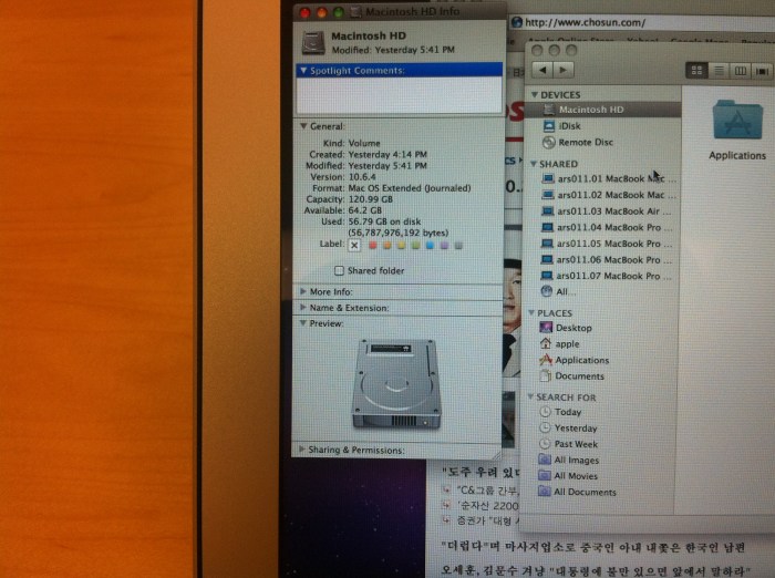 다만 하드용량은 64기가의 기본모델로는 무리가 있겠다 싶었다. 전시된 제품이 128기가 모델이었는데 하드용량을 보니 벌써 절반이 차있었기 때문이다. 데모용 음악, 동영상과 함께 iWorks, iLife 등이 깔려있는 정도였는데 말이다. 128기가도 사실 요즘엔 충분한 용량은 아니다.
