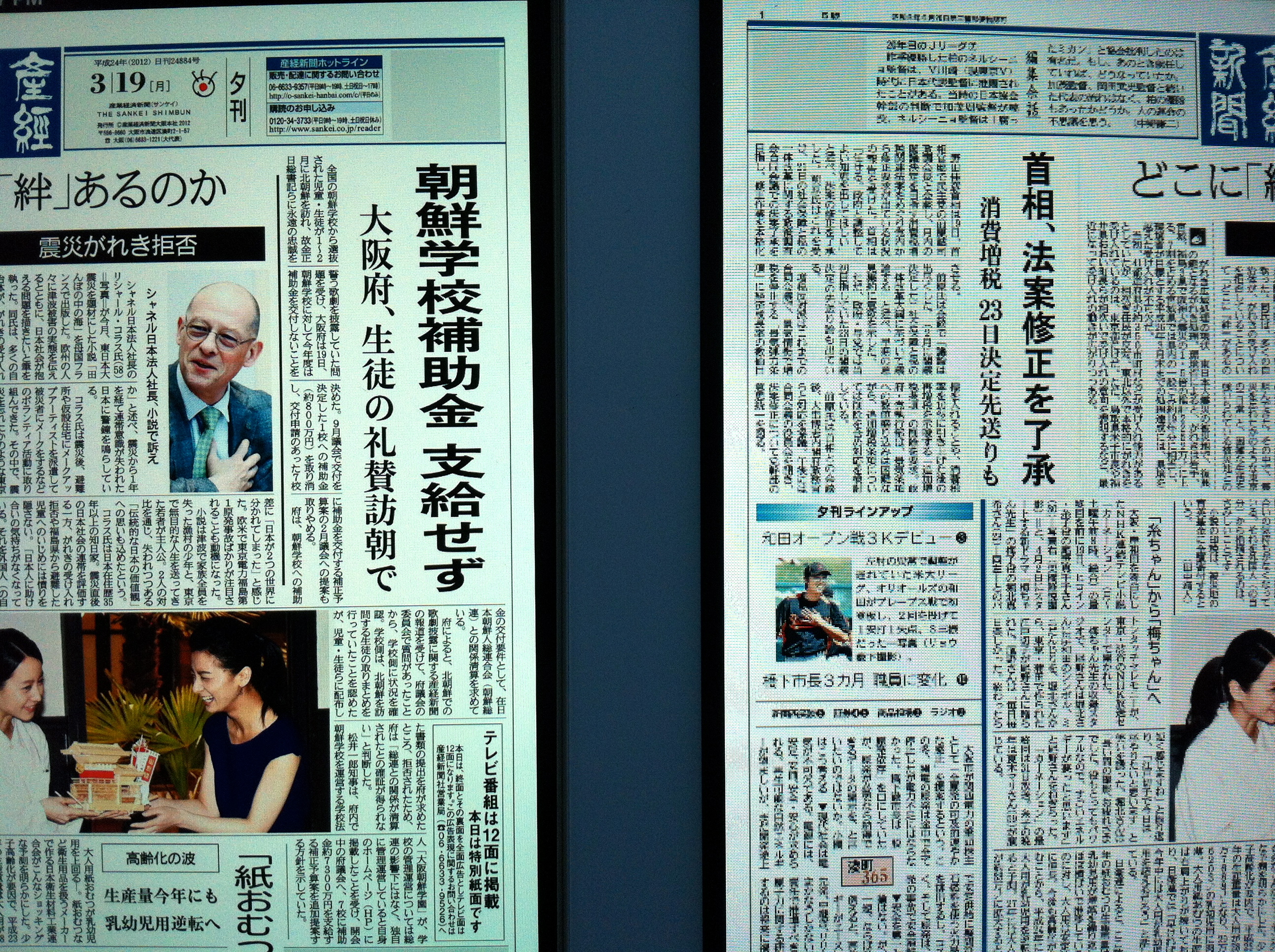 산케이신문앱으로 본 신문이미지. 오른쪽이 아이패드2. (이 이미지를 클릭해서 최대한 확대해서 보시면 그 차이를 느낄 수 있음.) 이젠 진짜 신문을 종이로 받아서 볼 필요가 있을까하는 생각이 들 정도.