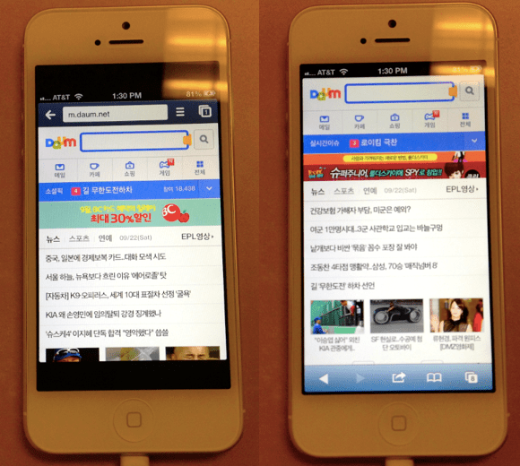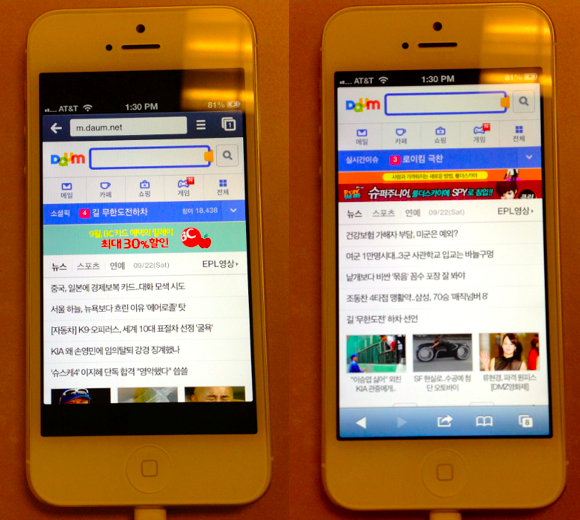 예를 들어 위 사진에서 왼쪽은 크롬앱, 오른쪽은 사파리를 이용해 다음 모바일페이지를 열어본 모습이다. 보시다시피 아직 아이폰5에 최적화가 되지 않은 크롬앱의 경우는 위아래로 까만 공간이 남아있다. 유튜브앱도 그렇고 구글의 앱은 아직까지 아이폰5 최적화가 이뤄지지 않았다. (며칠안에 될 것으로 보인다.)