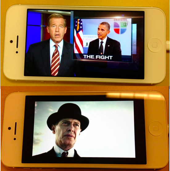 동영상의 경우도 마찬가지다. 위는 아이폰5에 최적화가 된 팟캐스트앱으로 본 NBC뉴스의 화면이다. 동영상사이즈가 아이폰5에 딱 맞는다. 아래는 아직 최적화가 되지 않은 HBO GO앱으로 보드웍엠파이어를 본 화면이다.