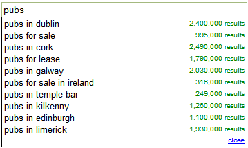 예를 들어 위는 아일랜드에서 ‘Pubs’라는 단어를 검색했을 때 나타나는 검색추천어들이다. 당연하게도 dublin이 맨 위에 나타난다. 그리고 Cork, Galway 모두 아일랜드의 대도시들이다.