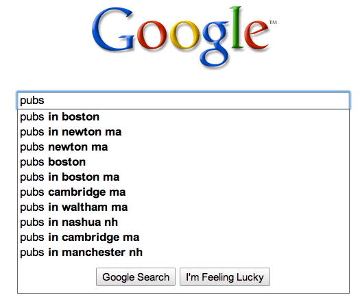 그런데 보스턴에서 ‘Pubs’를 검색하면 이렇게 나온다. Newton, Cambridge, Waltham 모두 보스턴 인근 지역이다. 역시 그 지역에서 많이 검색하는 빈도수 순서로 검색어추천이 나오는 듯 싶다.