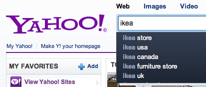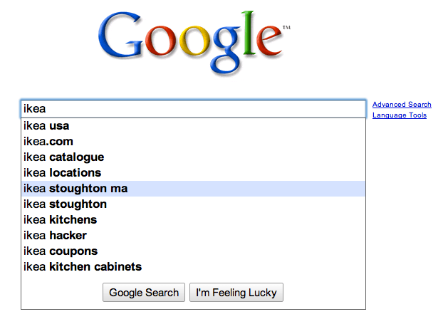대형가구점인 아이키아(Ikea)를 검색할 때도 그렇다. 보스턴에서 검색하면 이 지역에서 가장 가까운 곳에 있는 Ikea지점인 Stoughton이 같이 검색추천어로 뜬다. 다른 지역에서 검색하면 아마 그 지역에서 가장 가까운 지역의 이름이 추천으로 뜰 것이다.