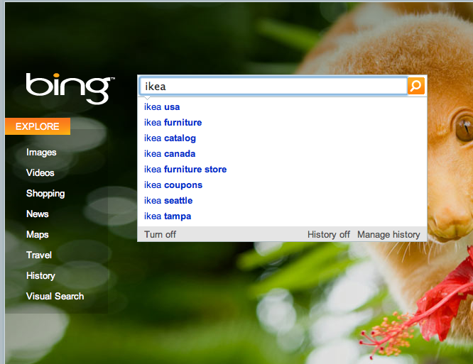 가구점 Ikea의 경우도 마찬가지. 역시 Bing검색이 MS본사가 있는 시애틀에서 많이 이루어지는 모양인지 시애틀이 추천검색어로 들어있는 것이 특이하다.