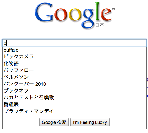 대부분의 일본인들은 일본어를 입력할때 로마자 알파벳으로 입력하는 방식을 선호하기에 영문자 b를 입력해도 이같은 검색추천어가 뜨는 듯. 빅카메라, 북오프 등 대형 소매체인과 함께 다양한 인기검색어가 뜨는 듯.