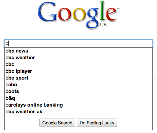 마지막으로 영국의 경우를 구글UK로 약간 테스트. b를 입력하자 당연히 영국최대의 방송사인 bbc관련된 검색추천이 대부분 떠오름. 그밖에 Boots는 영국의 약국체인, Bebo는 영국에서 인기있는 소셜네트워크서비스 등등…