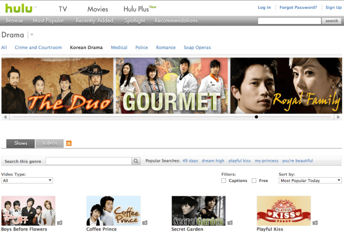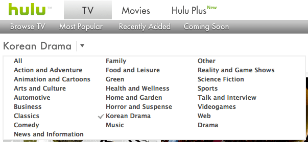 한국드라마가 Hulu의 25개의 TV장르분류중 하나의 카테고리로 당당하게 들어간 것이다. 위에 보면 알겠지만 ‘Korean Drama’를 제외하고는 모두 일반적인 비즈니스, 코미디, 뉴스 같은 평범한 장르분류다. 다른 국가별 TV콘텐츠분류가 존재하는 것도 아닌데 유독 한국드라마를 따로 분류해놓았다.