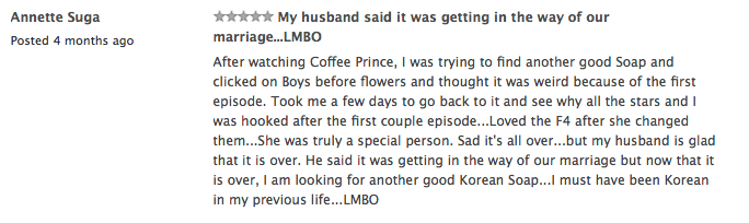 한국드라마때문에 결혼생활에 문제가 있다고 남편이 불평하고 있다는 위 댓글이 재미있다. 전생에 자기가 한국인이었을지도 모르겠다고 한다.^^