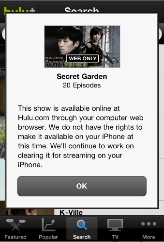 사족한가지 – 몇번 트윗을 통해 이야기한 일이 있는데 한국드라마가 Hulu를 통해서 제공되고는 있지만 아이폰, 아이패드앱을 통해서는 볼수가 없다. 한국의 저작권자가 판권상 PC웹사이트에서만 볼 수 있도록 허용했다는 것이다. 하지만 요즘 미국에서 아이폰과 아이패드를 이용한 콘텐츠소비가 급증하고 있는 만큼, 이같은 제한을 풀어주는 것이 바람직할 듯 싶다. 모바일기기상에서도 똑같이 광고가 돌아가기 때문에 콘텐츠소유자는 하나도 손해볼 것이 없다. 다른 미국콘텐츠는 다 보이는데 한국콘텐츠만 아이폰-아이패드에서 볼 수 없어서 불편하다는 댓글이 꽤 보인다.