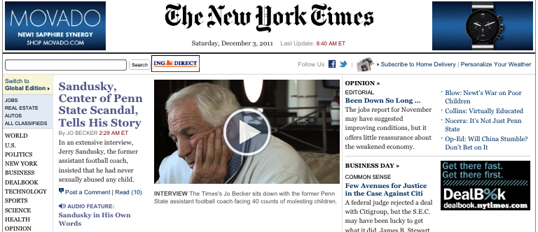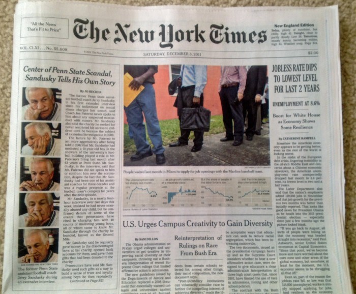오늘 아침 뉴욕타임즈 1면. 성희롱스캔들로 지난 몇주동안 미국을 뒤흔들었다고 해도 과언이 아닌 펜스테이트대학 전 미식축구코치 샌더스키의 인터뷰기사를 특종으로 실었다. (참고기사: 탐욕이 키운 미국판 도가니(시사인)) 오늘 하루종일 미국미디어들은 이 기사를 받아서 보도하기에 바빴다.