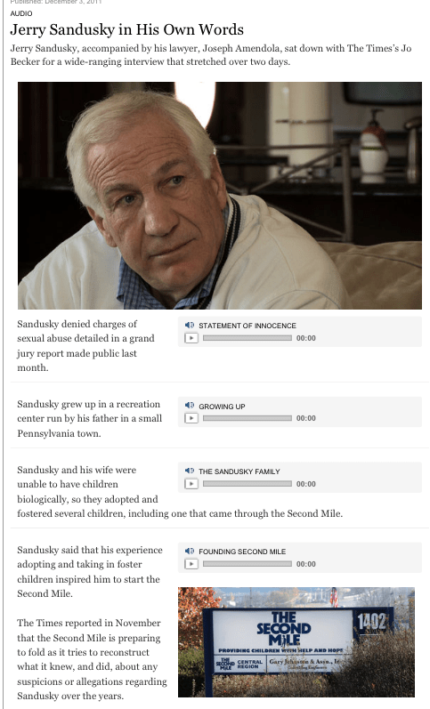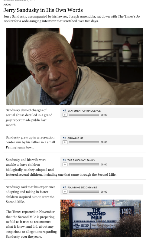 결론적으로 미국사회에 큰 논란을 일으킨 이번 스캔들의 당사자를 단독인터뷰해서 보도하는데 있어 뉴욕타임즈는 온라인의 장점을 최대한 활용, 샌더스키코치의 육성을 최대한 그대로 담아내기 위해 노력한 듯 싶다. 주요 내용을 편집한 동영상을 제공하는 것도 쉽지 않았을텐데 인터뷰내용의 핵심을 담은 오디오파일까지 일일히 편집해 제공하고 있다. 그리고 이 사건을 다룬 법원의 공식문서까지 제공하고 있다.