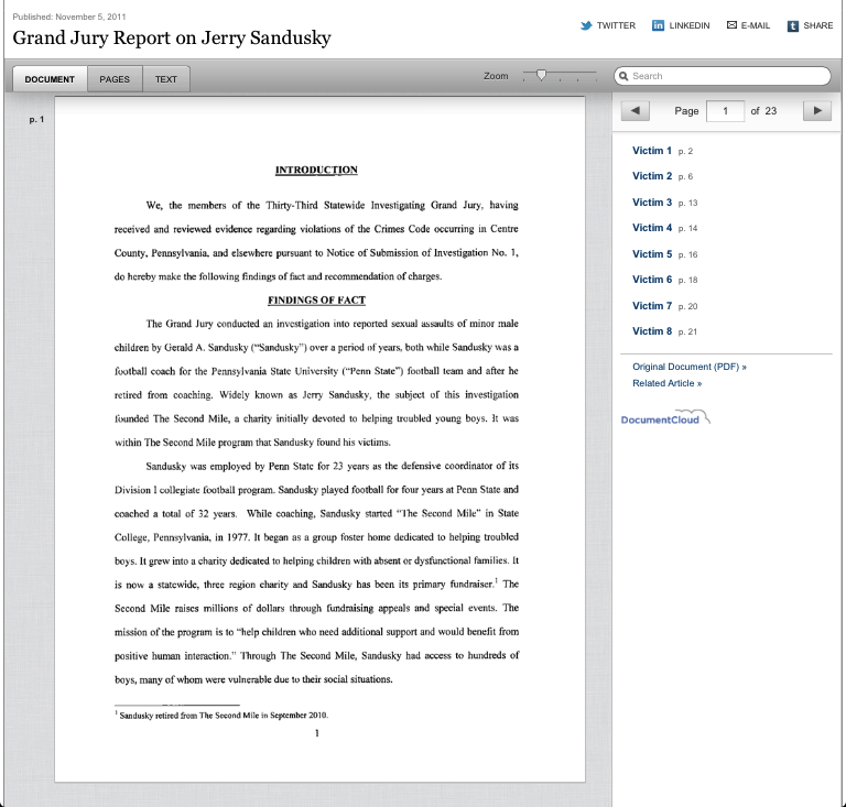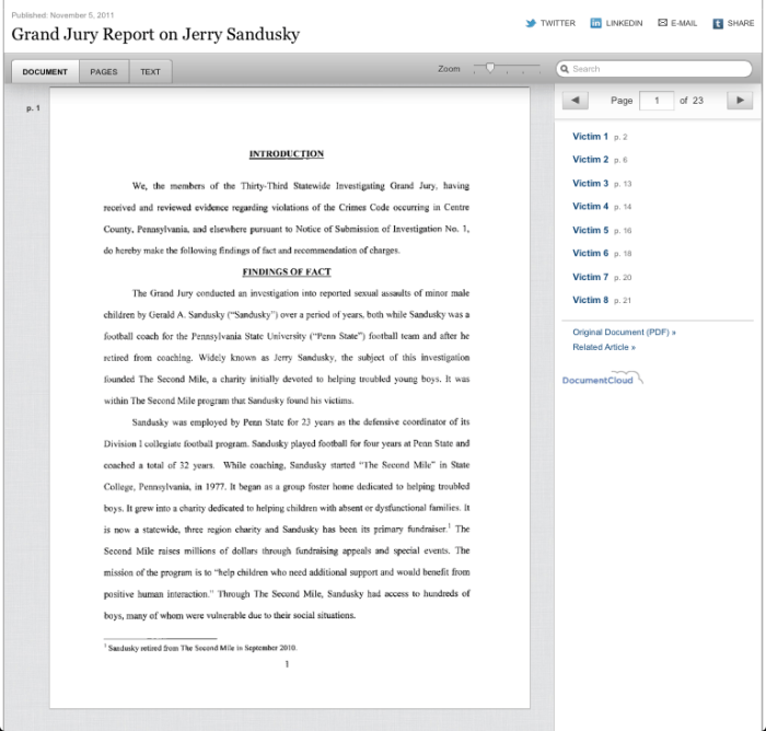 위처럼 샌더스키스캔들에 대한 23페이지짜리 배심원리포트원본을 그대로 제공하고 있는 것도 인상 깊다. 즉, 필요하면 독자가 직접 읽어보고 판단할 수 있도록 한 것이다.