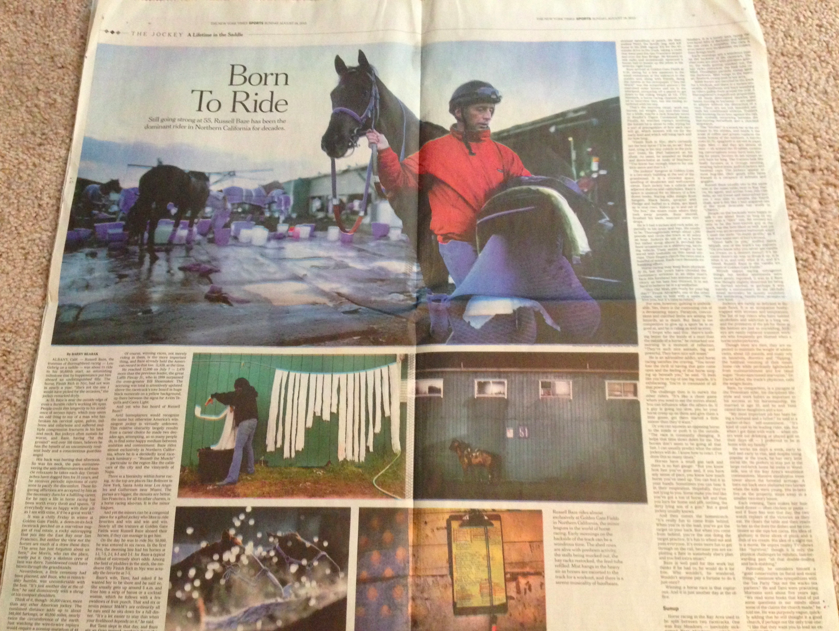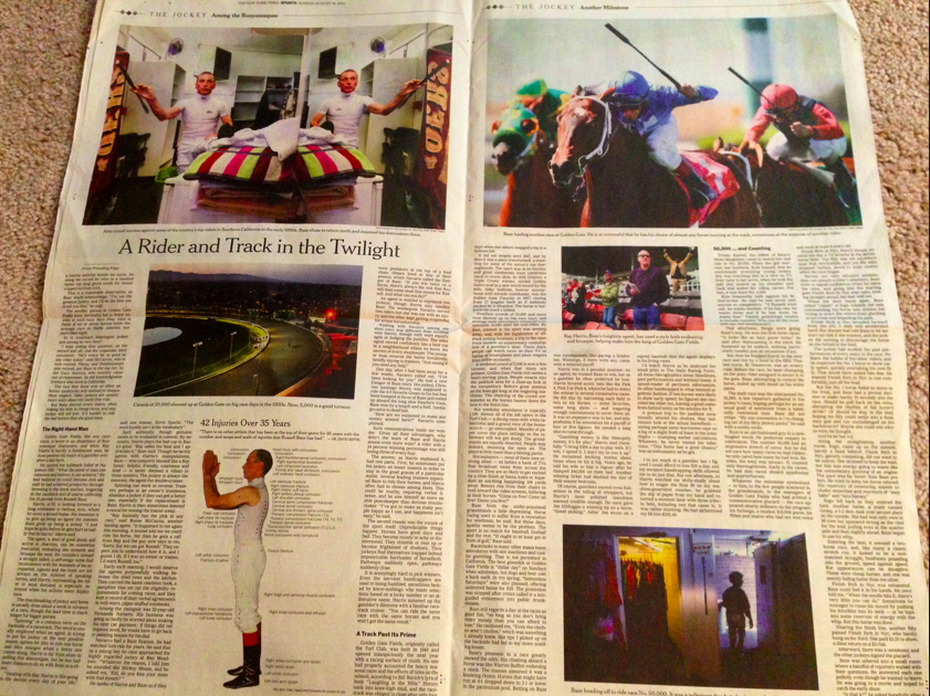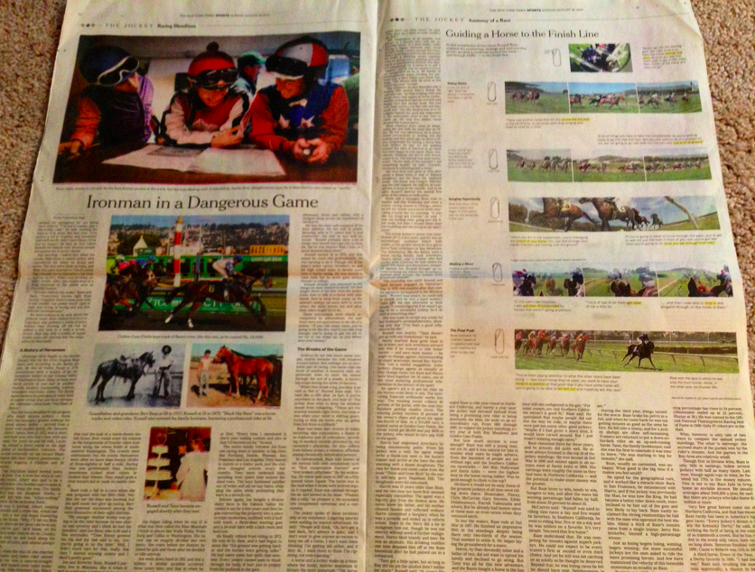 그리고 오늘 일요판 스포츠섹션에 평생동안 5만회이상 출전한 55세의 경주마 기수에 대한 이야기가 실렸다. 자그마치 6개면에 걸친 소설같은 분위기의 심층 취재기사다. 종이지면의 모습은 다음과 같다. (이런 기사들이 실리는 일요판은 한국에서는 상상하기 어려울 정도로 두껍고 양이 많다.)
