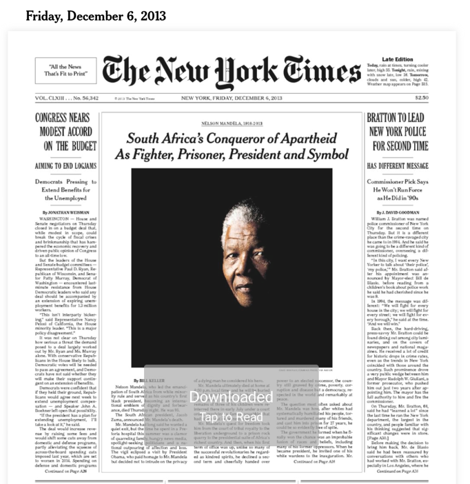 NYT의 경우도 마찬가지다. 종이신문에서는 1면톱에 이어 전면으로 3페이지를 할애한 긴 부고기사가 실렸다. 작은 책으로 내도 될 정도의 양이다. 2007년에 당시 편집국장이던 빌 켈러가 남아공을 방문해서 만델라를 (부고기사를 위해) 미리 인터뷰했을 정도로 오래전에 준비해 두었던 부고기사다.