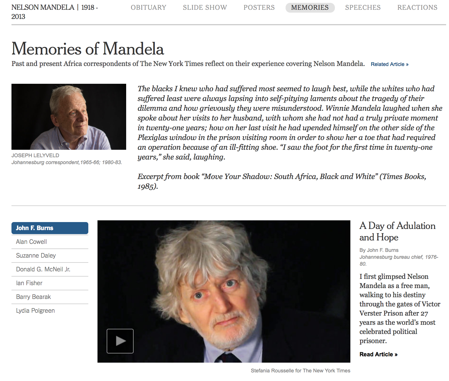 만델라의 Memories 부분에는 남아공지국에 근무한 역대 NYT지국장들이 나와 만델라에 대한 회상을 공유한다. 인터뷰 동영상까지 꼼꼼이 집어넣었다.