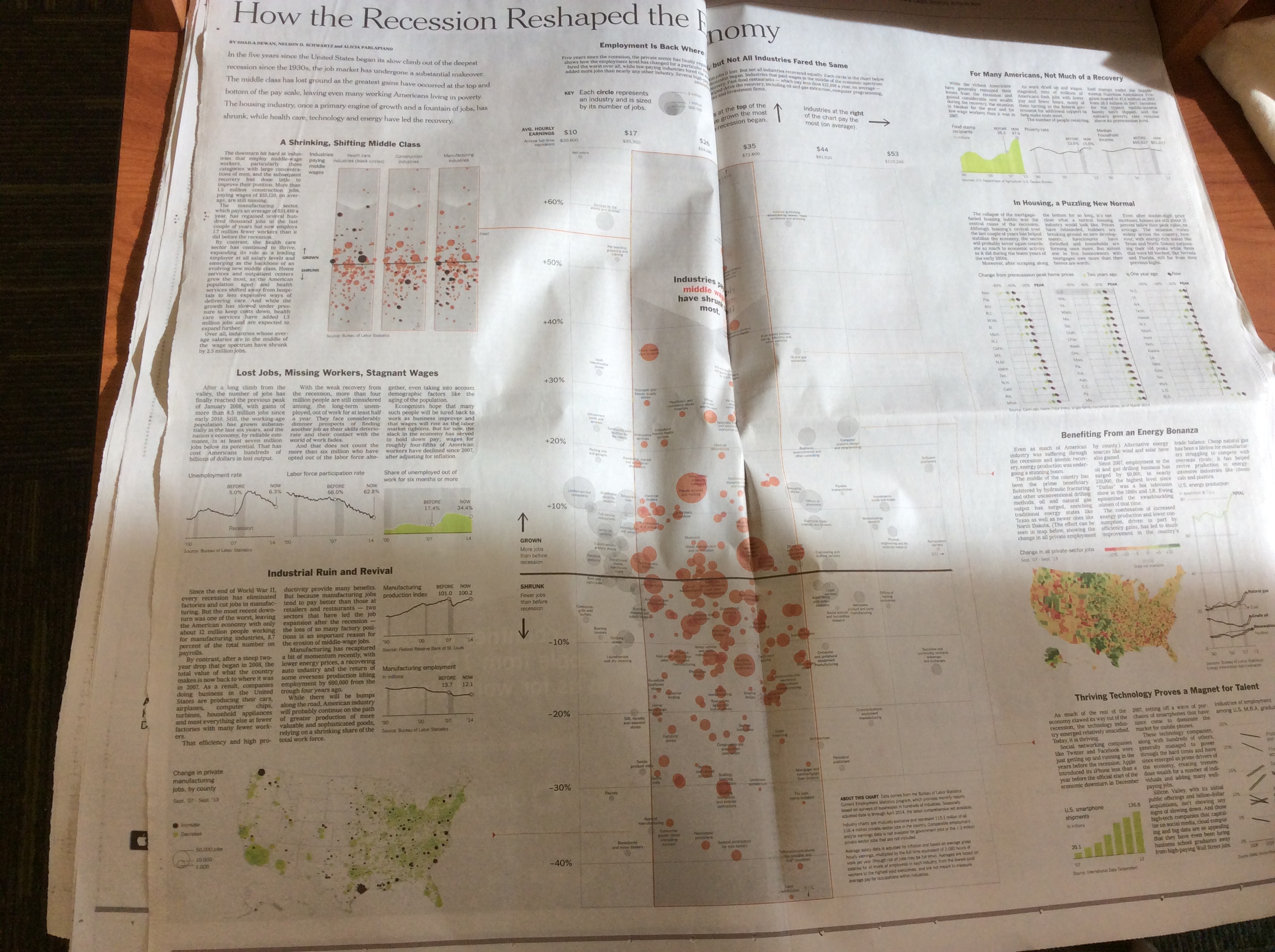 그런가 했는데 오랜만에 NYT를 종이지면으로 보다가 이렇게 큰 그래픽 기사를 만났다. “불황이 미국경제를 어떻게 변모시켰나”(How the Recession Reshaped the Economy)가 큰 제목이었다.