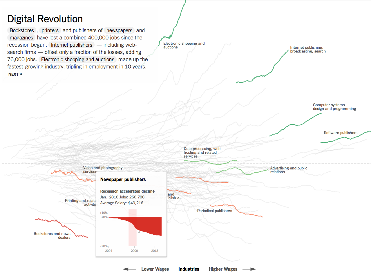 지난 10년간의 미국경제를 각 산업별로 워낙 세밀하게 분석한 귀중한 기사같아서 온라인에서는 어떻게 만들었나 보고 싶었다. 그래서 집에 와서 다시 NYT.com을 통해 그 기사를 찾아보았다. 알고 보니 The Upshot에서 만든 그래픽기사였다. 그리고 자세히 들여다보고 정말 감탄했다.