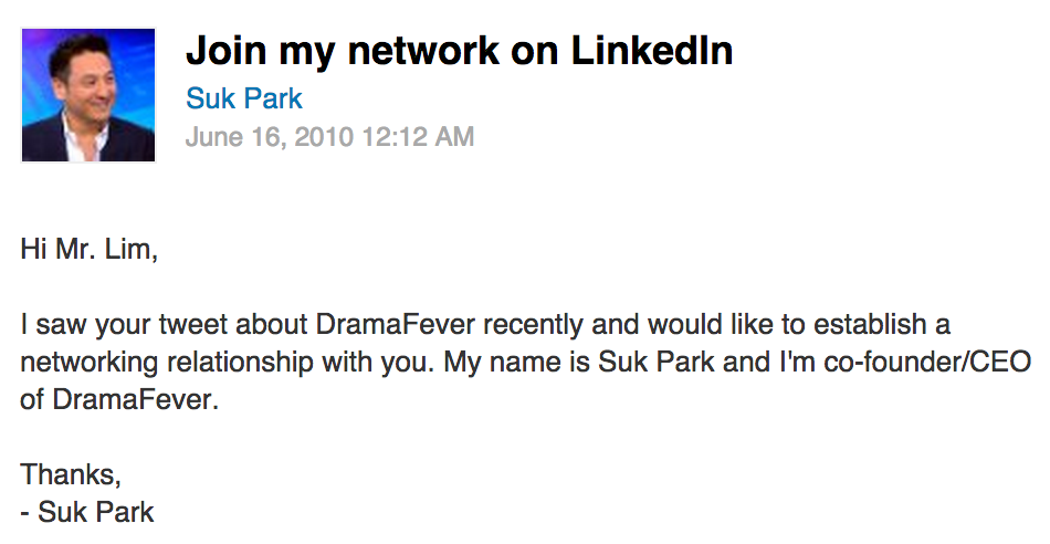 이 트윗으로 인해서 드라마피버의 방문자가 아주 조금 늘었을 것이다. 그런데 며칠뒤 링크드인을 통해서 예기치 않은 메시지를 받았다.