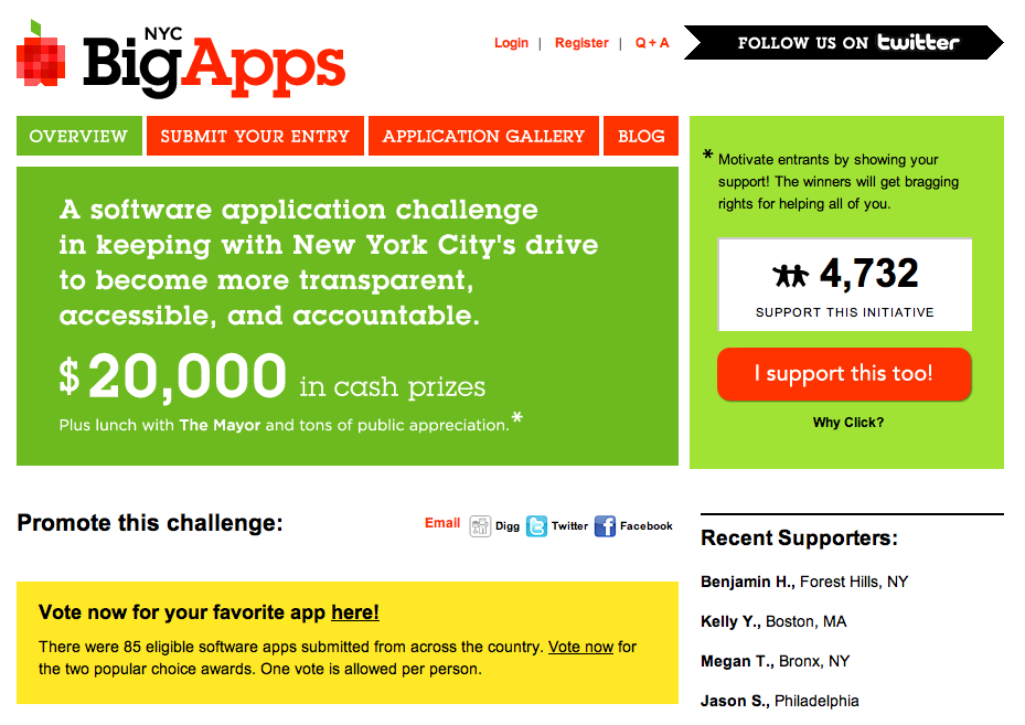 뉴욕시는 2만불의 상금을 걸고 BigApps라는 어플개발콘테스트를 하고 있습니다. http://www.nycbigapps.com/ 뉴욕시의 데이터를 공개해 시를 더욱 투명하고 믿을만하게 만들겠다는 것입니다. 서울시도 본받아야!