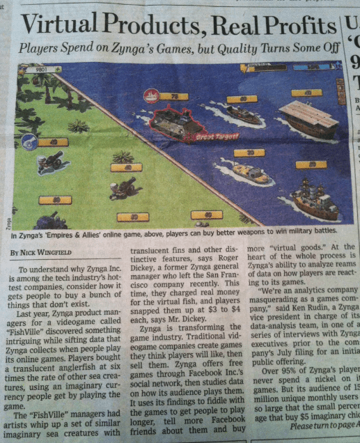 오늘자 월스트리트저널에 실린 “Virtual Products, Real Profits”라는 징가(Zynga)의 성공에 대한 무지무지 긴 기사. 페이스북을 기반으로 한 소셜게임 팜빌로 유명한 징가는 작년 6천억이 넘는 매출을 올렸고 지금은 약 20조가 넘는 기업가치로 상장을 준비중이다. (광파리님의 징가가 ‘게임업계의 구글’이 된다는데 포스팅참고)